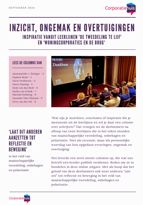 We vroegen de corporatiebestuurders die deelnamen aan onze leerlijnen ‘De Tweedeling te lijf’ en ‘Woningcorporaties en de brug’ of zij hun inzichten, inspiratie en/of ongemak naar aanleiding daarvan op papier wilden zetten. Niet als recensie van deze leerlijnen, maar als weerslag van hun eigen, persoonlijke “beweging”.