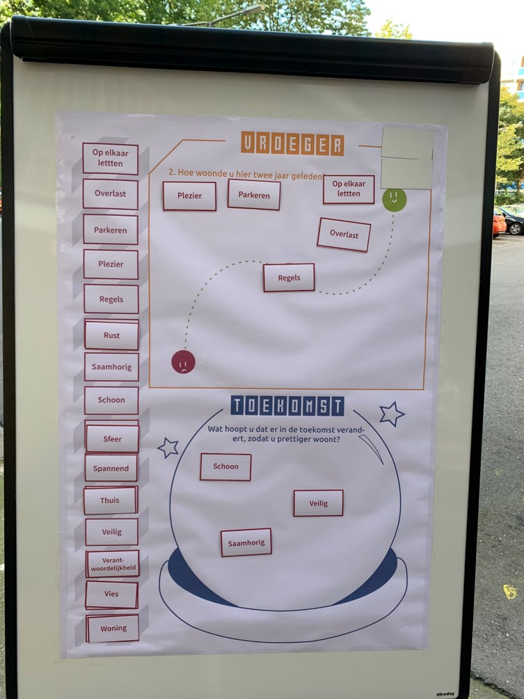 We gaan in gesprek met behulp van twee posters. Met de eerste poster gaan we met elkaar het gesprek aan over hoe het nu is. Waar ben je tevreden over? Waarover niet? En wat kan beter? Huurders plakken zelf de kaartjes met de thema’s. Deze themakaartjes helpen bij het gesprek. Vervolgens kijken we aan de hand van de tweede poster terug naar vroeger en naar de toekomst. Dit doen we om een goed beeld te krijgen van wat er speelt in het complex.